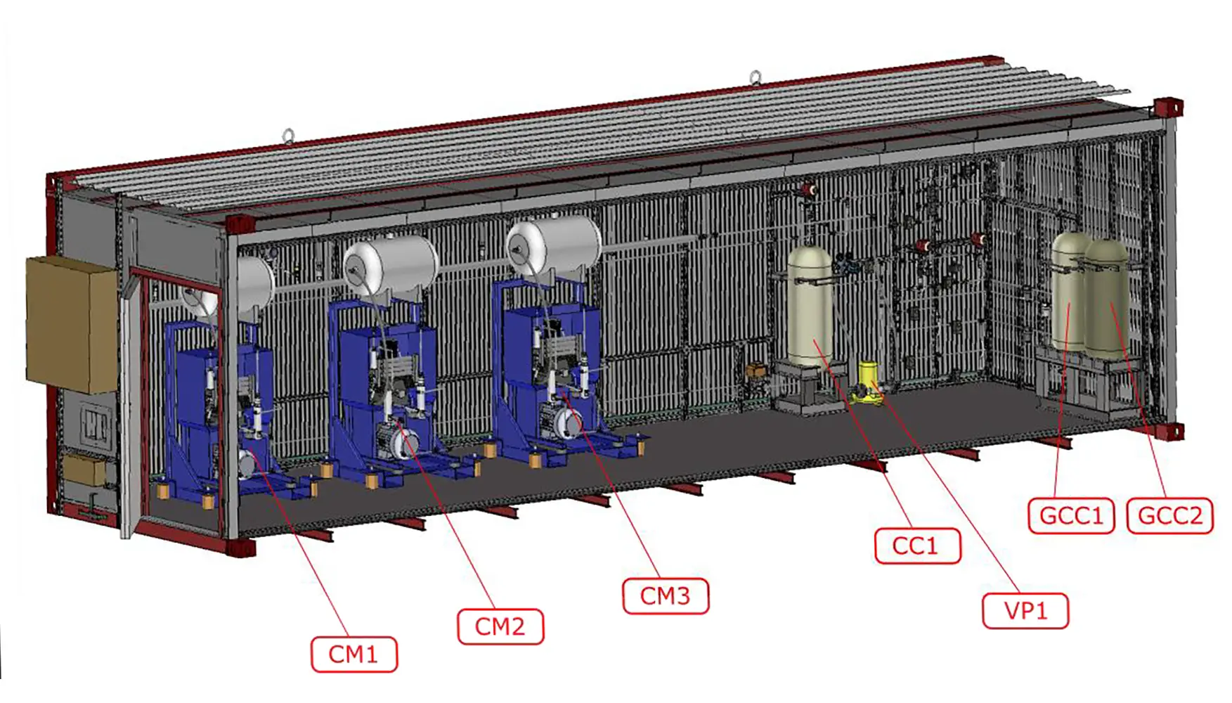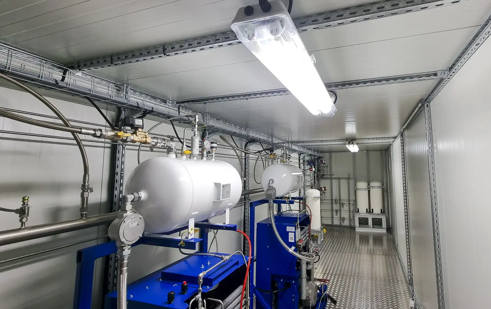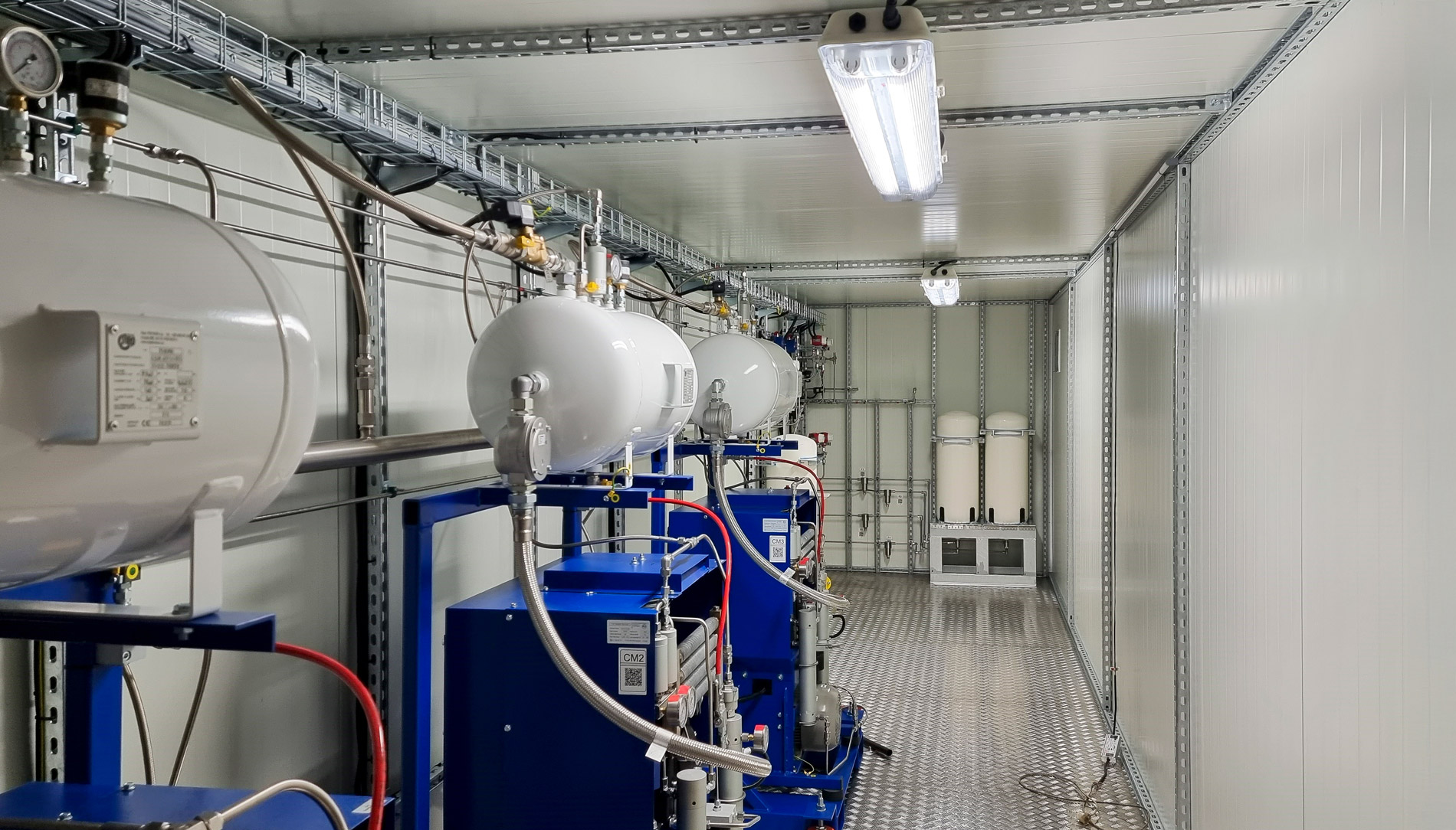 Obě frakce jsou skladovány ve svazku vysokotlakých lahví při tlaku 200 bar, umístěných v bezprostřední blízkosti kontejneru. Celý kontejner je vyroben v provedení ATEX.